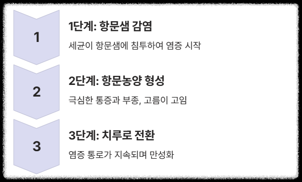 급성기에는 항문농양으로 나타나 극심한 통증과 항문 주변 부종을 유발합니다. 이 농양을 절개하여 고름을 빼내면 통증은 즉시 사라지죠. 하지만 문제는 이 농양이 터진 자리가 완전히 아물지 않고, 염증의 통로가 지속적으로 남게 된다는 점이에요.