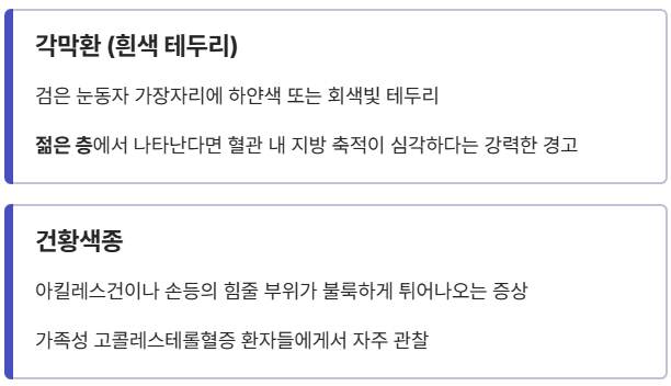 - 건황색종: 특히 아킬레스건이나 손등의 힘줄 부위가 불룩하게 튀어나오는 증상입니다. 가족성 고콜레스테롤혈증 환자들에게서 자주 관찰되는 지표입니다.