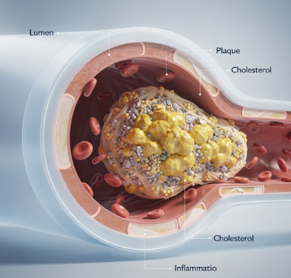 나쁜 콜레스테롤(LDL)이 혈관 벽에 달라붙으면 대식세포가 이를 잡아먹어 '포세포'를 형성합니다. 이것이 쌓여 혈관이 좁아지는 동맥경화로 이어지며, 압력이 높아지면 피부 가까운 곳까지 지방 물질이 밀려 나오게 되는 원리입니다.