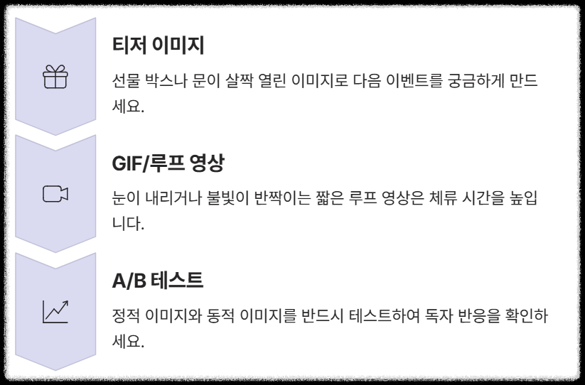 - 👉 GIF/루프 영상: 눈이 내리거나, 불빛이 반짝이거나, 오너먼트가 회전하는 짧은 루프 영상은 소셜 미디어에서 체류 시간을 높입니다.