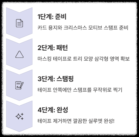 - 4단계 (마무리): 마스킹 테이프를 조심스럽게 제거하면, 깔끔한 실루엣의 스탬프 트리가 짠!