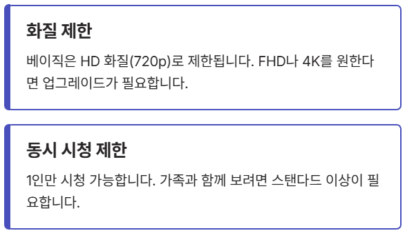 네이버 플러스 멤버십의 **티빙 베이직(무료)** 혜택은 **HD 화질(720p)로 제한**되며, **TV 연결이 불가능**합니다. 고화질로 스마트 TV에서 보시려면 스탠다드 이상으로 업그레이드가 필수예요. 또한, **실시간 LIVE 채널 중 일부 프리미엄 채널**은 이용이 제한될 수 있습니다.