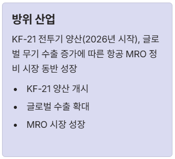 | ③ 방위 산업 | KF-21 전투기 양산(2026년 시작), 글로벌 무기 수출 증가에 따른 항공 MRO(정비) 시장 동반 성장. | #KF21 #방산항공주 |
