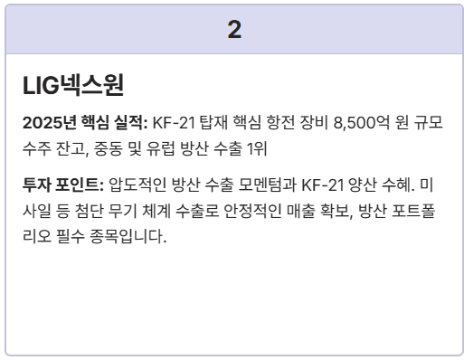 | 2위 | LIG넥스원 | KF-21 탑재 핵심 항전 장비 8,500억 규모 수주 잔고. 중동 및 유럽 방산 수출 1위 기록. | 압도적인 방산 수출 모멘텀 |