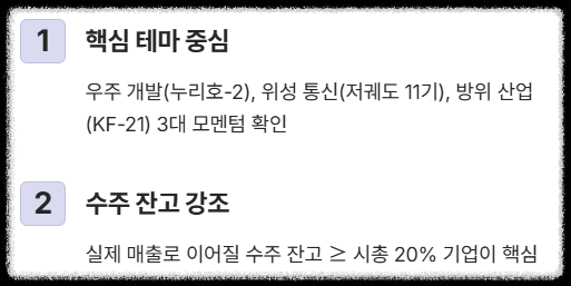 - 정책 모니터링: 우주항공청 예산 변동 및 정부의 저궤도 위성 11기 발사 계획 등 구체적인 일정을 실시간으로 모니터링해야 합니다.