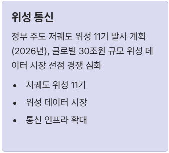 | ② 위성 통신 | 정부 주도 저궤도 위성 11기 발사 계획(2026년), 위성 데이터 시장(글로벌 30조원 규모) 선점 경쟁 심화. | #위성통신 #저궤도위성 |