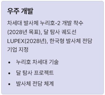 | ① 우주 개발 | 차세대 발사체 누리호-2 개발 착수(2028년 목표), 달 탐사 궤도선(LUPEX 2028), 한국형 발사체 전담 기업 지정. | #누리호 #차세대발사체 |
