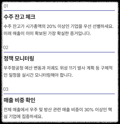 지금까지 살펴본 항공우주관련주 투자 전략의 핵심은 결국 '정부의 정책'과 '기업의 기술력 및 수주 잔고'입니다. 아래 체크리스트를 활용해서 나만의 성공적인 투자 포트폴리오를 점검해 보세요.