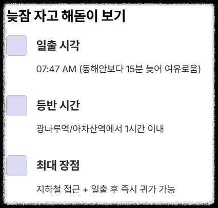 - ✅ 장점: 지하철로 바로 접근 가능하며, 일출 후 바로 따뜻한 집으로 복귀 가능.