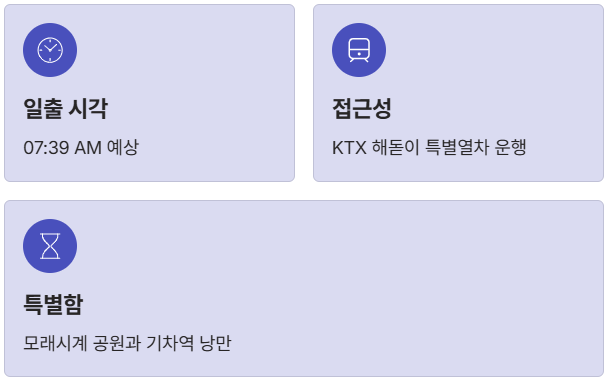 - 2026년 예상 일출 시각: **07:32 AM**으로 동해안 명소 중에서도 일찍 해를 볼 수 있습니다.