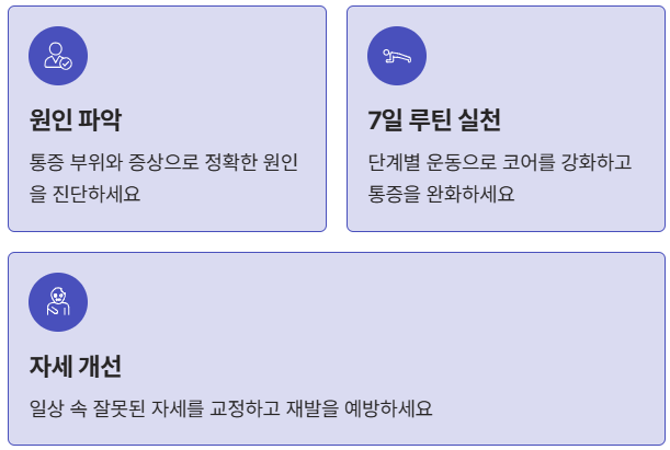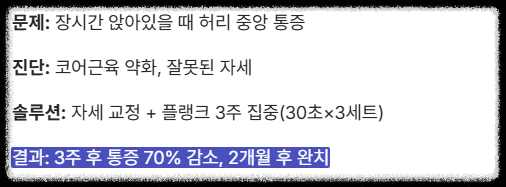 솔루션: 자세 교정 + 플랭크 3주 집중 훈련 (30초 x 3세트). → 3주 후 통증 70% 감소, 2개월 후 완치 판정.