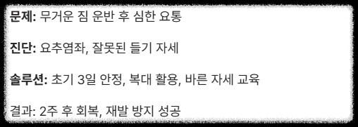 솔루션: 초기 3일 안정, 이후 복대를 활용한 코어 보조, 물건 들 때 반드시 무릎을 굽히는 '바른 자세 습관' 교육. → 2주 후 회복.