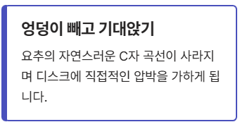 - 엉덩이를 앞으로 빼고 기대앉기 (슬라이딩): 요추의 자연스러운 C자 곡선이 사라져 디스크에 직접적인 압박을 줍니다.