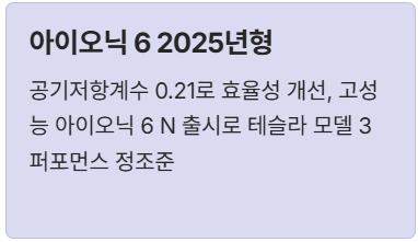 | 아이오닉 6 | 유선형 세단 | 효율, 주행성능 | 공기저항계수 0.21, 아이오닉 6 N 출시 |