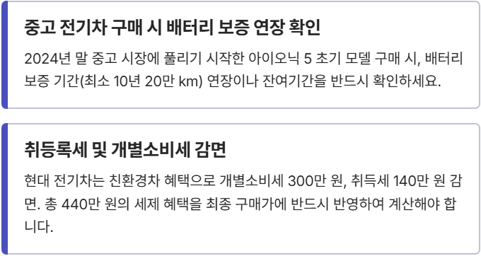 2024년 말 중고 시장에 풀리기 시작한 아이오닉 5 초기 모델을 구매한다면, **배터리 보증 기간(최소 10년 20만 km)** 연장이나 잔여기간을 반드시 확인하세요.
