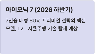 | 아이오닉 7 | 대형 SUV | 다인승 가족, 프리미엄 | 2026년 하반기 공개, 7인승 |