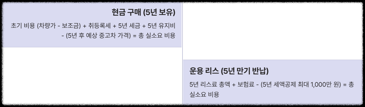 | 현금 구매 (5년 보유) | 초기 비용 (차량가 - 보조금) + 취등록세 + 5년 세금 + 5년 유지비 - (5년 후 예상 중고차 가격) = **총 실소요 비용** |