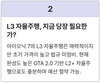 아이오닉 7에 적용될 **L3 자율주행** 기술은 매력적이지만, 초기 가격이 높고 법규가 아직 완벽히 정비되지 않았습니다. 현재 완성도 높은 **OTA 2.0 기반의 L2+ 자율주행**으로도 충분하며, 예산을 절약할 수 있습니다.