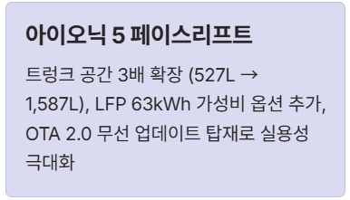 | 아이오닉 5 | 컴팩트 SUV | 패밀리카, 실용성 | 트렁크 3배 확장, LFP 63kWh 옵션 추가 |