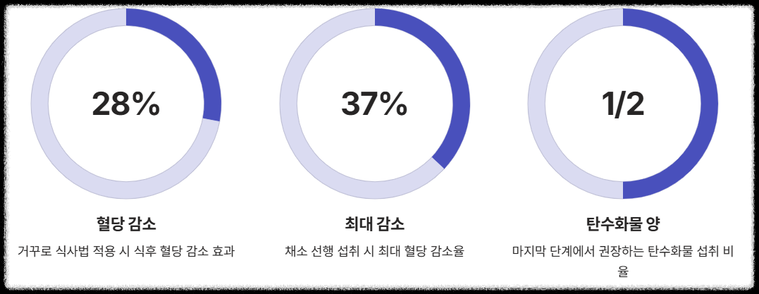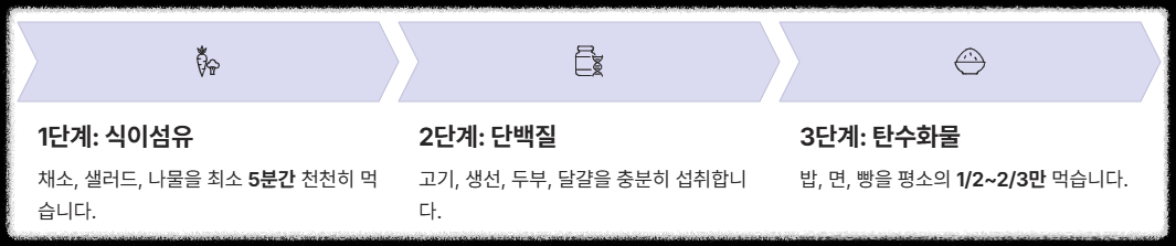 - 1단계: 식이섬유(채소, 샐러드, 나물)를 최소 5분간 천천히 먹는다.