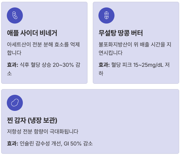 | 애플 사이더 비네거 | 아세트산이 전분 분해 효소 억제 | 식후 혈당 상승 20~30% 감소 |