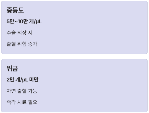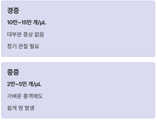 | 중증 | 2만 ~ 5만 미만 | 가벼운 충격에도 쉽게 멍이 들고 출혈 발생 + 치료 고려 |