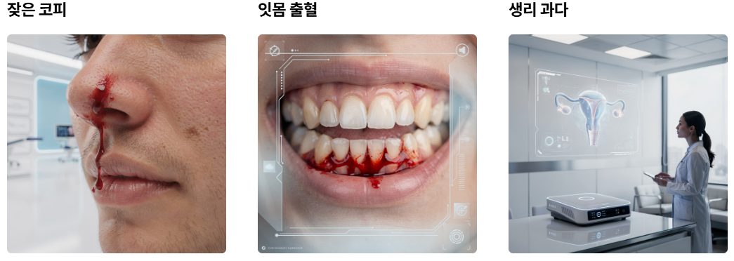 - 점막 출혈: 잦은 코피, 양치 시 잇몸 출혈이 대표적입니다. 피가 한 번 나면 10분 이상 잘 멈추지 않는 특징이 있어요.