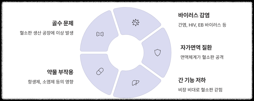 - 약물 부작용: 일부 항생제, 소염제, 심지어 특정 건강기능식품이 혈소판 생성을 억제하기도 합니다.