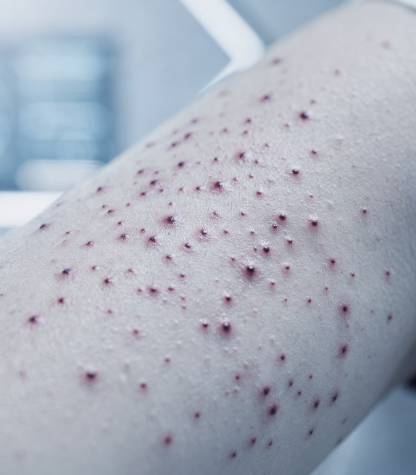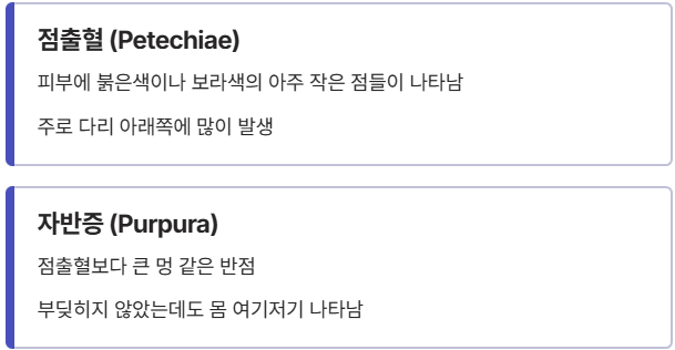 - 점출혈(Petechiae): 피부에 붉은색이나 보라색의 아주 작은 점들이 깔리는 현상이에요. 주로 다리 아래쪽에 많이 나타납니다.