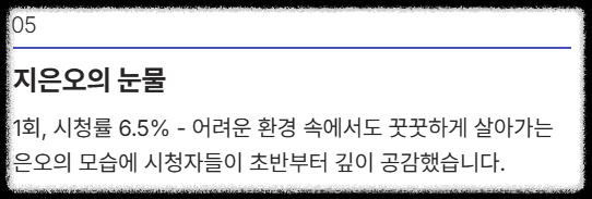 지혁이 고성희에게 "당신의 죄를 내가 덮지 않겠다"며 선언하는 장면. 정의로운 남주인공의 매력이 폭발했습니다. - **TOP 5: 지은오의 눈물 (1회, 시청률 6.5%)**