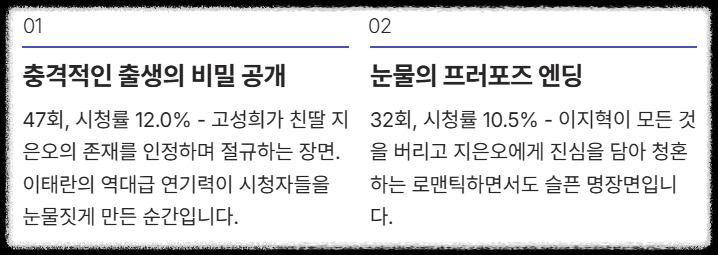 고성희가 친딸 지은오의 존재를 인정하며 절규하는 장면. 역대급 연기력으로 시청자들을 눈물짓게 만든 순간입니다. '이태란 연기 미쳤다', '엄마의 모성애에 결국 울었다' 등의 리뷰가 쏟아졌습니다. - **TOP 2: 눈물의 프러포즈 엔딩 (32회, 시청률 10.5%)**