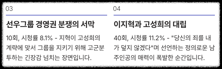 지혁이 고성희의 계략에 맞서 그룹을 지키기 위해 고군분투하는 모습. 긴장감 넘치는 재벌 암투극의 시작을 알렸습니다. - **TOP 4: 이지혁과 고성희의 대립 (40회, 시청률 11.2%)**