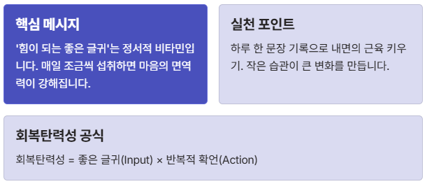 심리학자 브레네 브라운은 '자기 연민'이 회복탄력성의 핵심이라고 말합니다. 실수했을 때 자신을 비난하기보다, 소중한 친구에게 하듯 따뜻한 문장을 건네보세요. "그럴 수도 있지, 애썼어"라는 한마디가 세상을 바꿀 불씨가 됩니다.