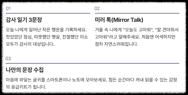 - 미러 톡(Mirror Talk): 거울 속 나에게 "오늘도 고마워"라고 말해주기