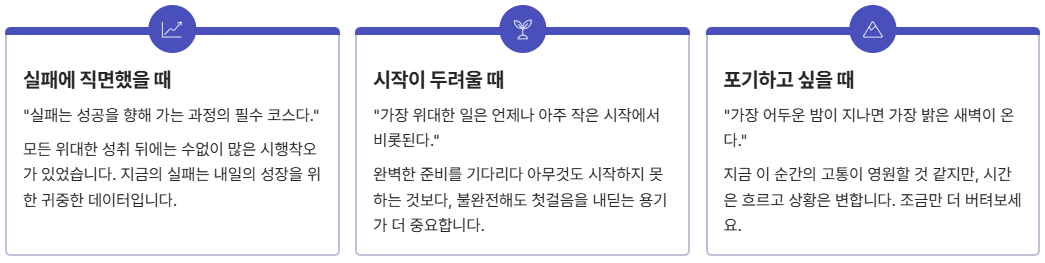 | 시작이 두려울 때 | "가장 위대한 일은 언제나 아주 작은 시작에서 비롯된다." |