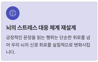 2025년 하버드 인간 발달 리뷰에 따르면, 긍정적인 자기 대화(Positive Self-talk)는 스트레스 호르몬인 코르티솔 수치를 유의미하게 낮춘다고 합니다. 좋은 글귀를 읽는 행위는 단순한 위로를 넘어 우리 뇌의 스트레스 대응 체계를 재설계하는 과정인 셈이죠.