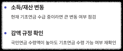 - ✅ 현재 기초연금을 받고 있다면, 소득이나 재산의 큰 변동이 있었는지 확인한다.