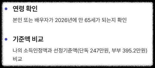 - ✅ 본인 또는 배우자가 2026년에 만 65세가 되는지 확인한다.