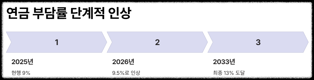 소득대체율 상향과 함께 국민연금 재정 안정을 위해 연금 부담률도 단계적으로 인상됩니다. 현재 9%인 연금 부담률이 2026년부터는 9.5%로 0.5% p 인상되고, 이후 2033년까지 매년 0.5% p씩 올라 최종적으로는 13%에 도달하게 됩니다.