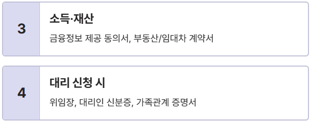 | 소득·재산 서류 | 금융정보 제공 동의서, 부동산/임대차 계약서, 급여명세서 등 |