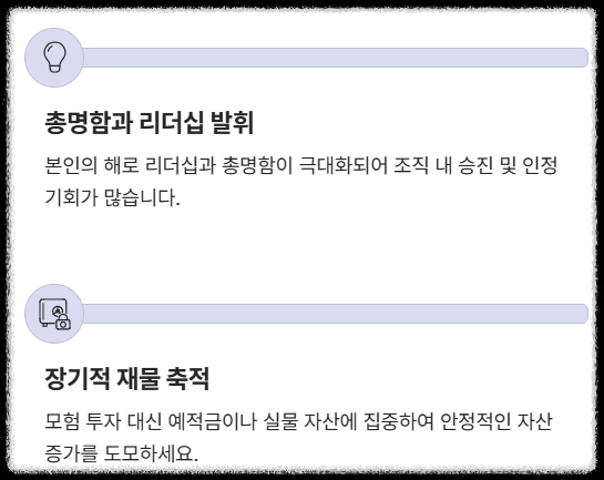 - 재물은 장기적 축적 중심: 모험 투자 대신 예적금이나 실물 자산에 집중하여 안정적인 장기 자산 증가를 도모해야 합니다.