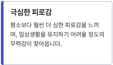 - 극심한 피로감: 평소보다 훨씬 더 심한 피로감을 느끼며, 일상생활을 유지하기 어려울 정도의 무력감이 찾아옵니다.