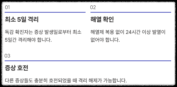 2025년 최신 지침에 따라 독감 확진자는 증상 발생일로부터 최소 5일간 격리해야 합니다. 더불어, 해제 시점은 '해열제 복용 없이 24시간 이상 발열이 없고' 다른 증상도 호전되었을 때입니다. 이 기준을 반드시 지켜야 확산을 막을 수 있어요.