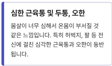- 심한 근육통 및 두통, 오한: 몸살이 너무 심해서 온몸이 부서질 것 같다고 표현하는 분들이 많아요. 특히 허벅지, 팔 등 전신에 걸친 심각한 근육통과 오한이 동반됩니다.