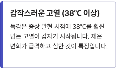 - 갑작스러운 고열 (38℃ 이상): 독감은 증상 발현 시점에 38℃를 훌쩍 넘는 고열이 갑자기 시작되는 경우가 대부분입니다. 체온 변화가 급격하고 심합니다.