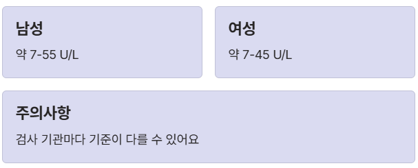 최신 기준에 따르면 일반적인 정상 범위는 남성 약 7~55 U/L, 여성 약 7~45U/L 정도로 봅니다. 하지만 이건 절대적인 수치는 아니에요! 검사 기관이나 연령에 따라 기준이 조금씩 다를 수 있으니, 꼭 자신의 결과지에 적힌 '참고치'를 먼저 확인해 보세요.