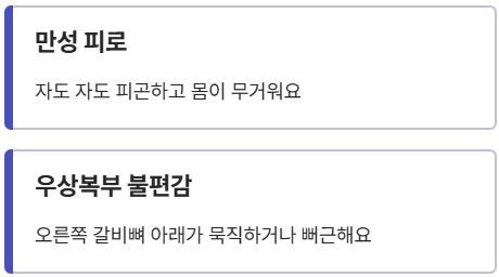 - 우상복부 불편감: 오른쪽 갈비뼈 아래쪽이 묵직하거나 뻐근한 느낌이 들어요.