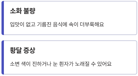 - 소화 불량: 입맛이 없고 기름진 음식을 먹으면 유독 속이 더부룩해요.