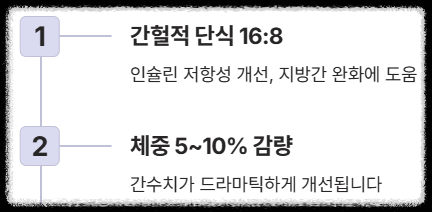 체중의 5~10%만 감량해도 간수치는 드라마틱하게 좋아집니다. 16:8 간헐적 단식은 인슐린 저항성을 개선해 지방간 완화에 도움을 줄 수 있다는 연구가 많아요. 운동은 매일 30분씩 '약간 숨이 찰 정도'의 빠르게 걷기가 가장 좋습니다. 너무 무리한 고강도 운동은 오히려 간수치를 일시적으로 높일 수 있으니 주의하세요!