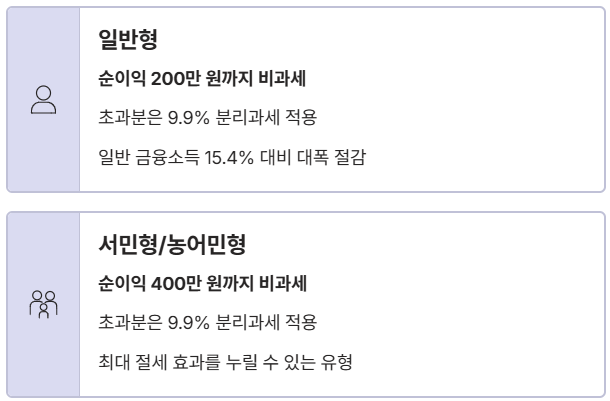 - 일반형 (청년/서민형 외): 순이익 200만 원까지 비과세, 초과분은 9.9% 분리과세